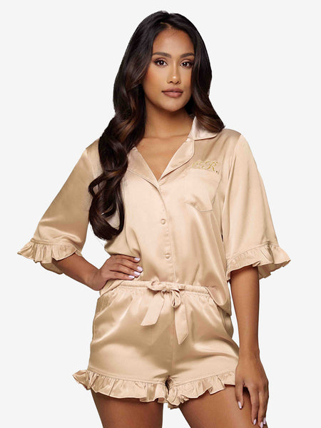 • The Le Olive personalised Ruffle pajamas are super comfortable and a must-have for a great night's sleep. The fabric feels as soft as satin and has stretch for extra comfort. Make your favorite even more special by adding a personalisation of your name or initials on the chest. Sweet dreams.💞