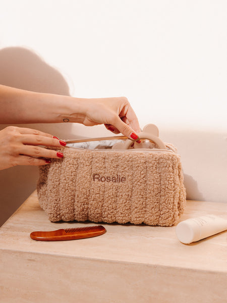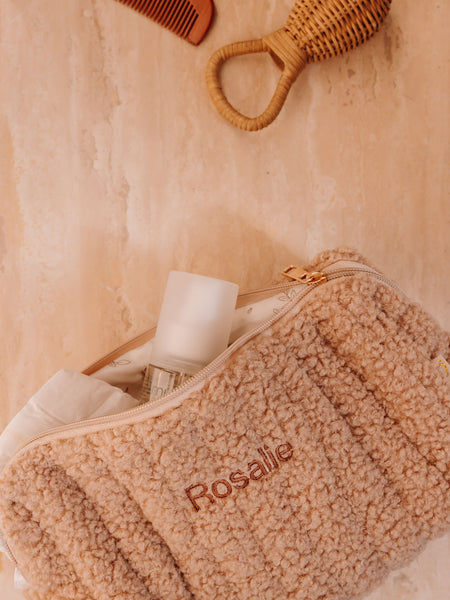• Nuestra preciosa pouch está hecha de una tela teddy extremadamente suave y ofrece el lugar perfecto para guardar todos los imprescindibles del bebé. La pouch está forrada con un estampado adorable y cuenta con un bolsillo adicional, mientras que la cremallera mantiene todo seguro. Personaliza la pouch teddy con el nombre de tu pequeño. Cada pouch se borda con amor en nuestro propio taller con los hilos más bonitos. ¿Te has enamorado, al igual que nosotros, de esta pouch teddy? Completa el set con el bolso de pañales, el cambiador y el portabiberones a juego.