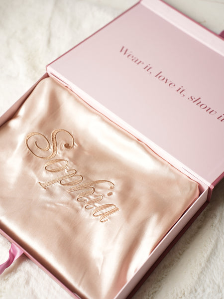 • Personnalisez votre kimono avec une broderie sur le devant ou le dos. Choisissez une couleur et personnalisez votre kimono avec votre prénom ou un autre texte. Tout est possible. La couleur de la personnalisation est également à votre choix. Un kimono personnalisé est un véritable attrait pour le regard, que vous pouvez porter de plusieurs façons. Que vous le portiez à la maison ou sur la plage, les belles photos que l’on peut faire avec sont superbes à partager! Un kimono personnalisé n’est pas seulement super amusant pour vous, c’est aussi un excellent cadeau. Nous vous offrons la possibilité de l’emballer dans un coffret cadeau deluxe. Vous pouvez compléter votre ensemble avec un masque de sommeil assorti! Vous pouvez même avoir le masque de sommeil personnalisé. Soyez prête pour le dodo en beauté!