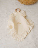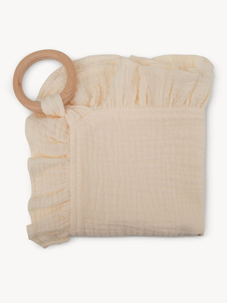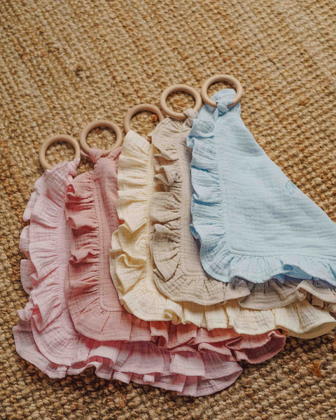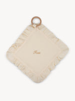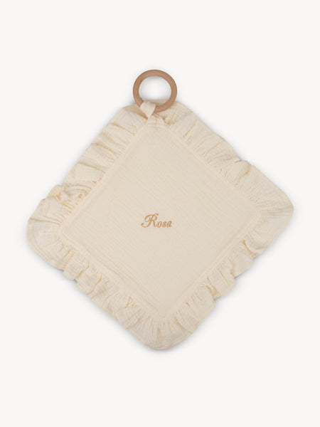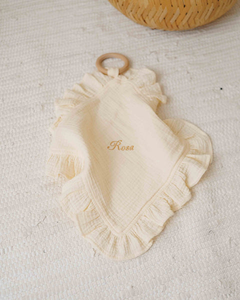 • Deine Baby-Essentials: Wie praktisch ist dieses Mull-Schnullertuch! Ein Beißring, ein Schnuller und eine Mullwindel. Dieses Schnullertuch aus 100 % Baumwolle ist ideal zum Beißen und Spielen. Das Tuch hat auch eine praktische Schlaufe, um einen Schnuller oder Beißring zu befestigen. Die klassischen Rüschen am Schnullertuch machen es noch niedlicher, und du kannst es noch persönlicher gestalten, indem du den Namen deines Kindes darauf angibst. Hast du dich, wie wir, in das Mull-Schnullertuch verliebt? Dann vervollständige das Set mit den Rüschen-Mullwindeln in kleinen und großen Größen.
