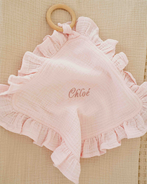 • Deine Baby-Essentials: Wie praktisch ist dieses Mull-Schnullertuch! Ein Beißring, ein Schnuller und eine Mullwindel. Dieses Schnullertuch aus 100 % Baumwolle ist ideal zum Beißen und Spielen. Das Tuch hat auch eine praktische Schlaufe, um einen Schnuller oder Beißring zu befestigen. Die klassischen Rüschen am Schnullertuch machen es noch niedlicher, und du kannst es noch persönlicher gestalten, indem du den Namen deines Kindes darauf angibst. Hast du dich, wie wir, in das Mull-Schnullertuch verliebt? Dann vervollständige das Set mit den Rüschen-Mullwindeln in kleinen und großen Größen.